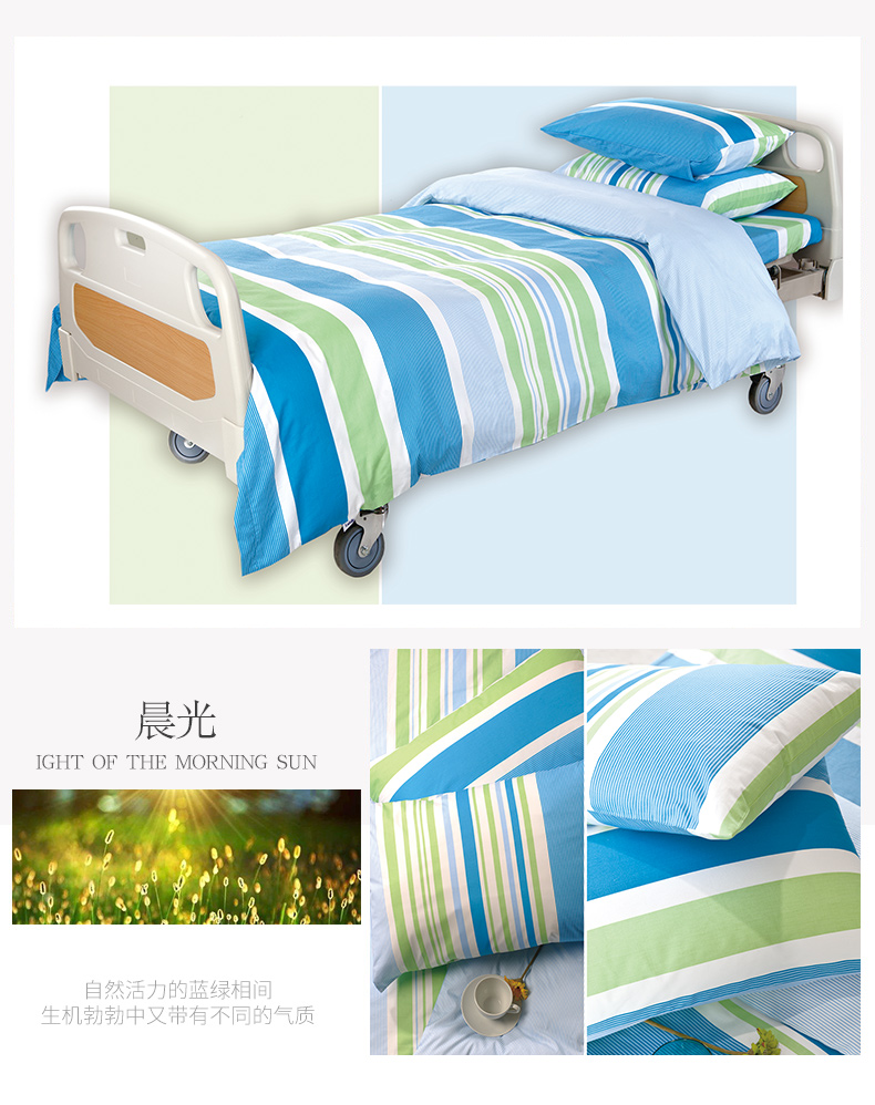 能用于医院的床单被套必须耐洗耐用,透气性好,防敏感度高,防皱性能好,易洗耐磨不易起球,活性印染不易褪色。